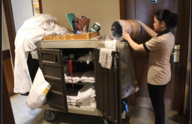 ( setelah manaruh linen yang kotor kedalam trolley bag, kembali masuk ke kamar dengan membawa linen bersih, perlengkapan kebutuhan tamu dan perlengkapan kebersihan sesuai dengan kebutuhan )