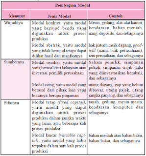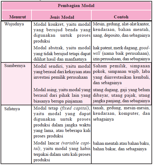 Contoh lain faktor produksi modal bagi sebuah perusahaan roti adalah uang tunai, persediaan tepung, mesin pembuat roti, gedung, tanah, kendaraan, dan sebagainya. Untuk lebih jelasnya lihatlah pembagian modal berikut ini: